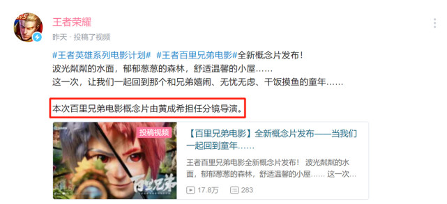 在这次放出《王者荣耀》大电影概念片的时候也是公布了这个概念片的分镜导演,他就是黄成希导演。相信不少网友对于黄成希导演应该不会陌生,他是国漫《一人之下》第三季的导演,同时也是《火影忍者:博人传》第65集的导演。